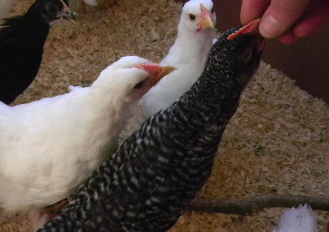 Those speckled Cheeples are fast turning into my favorites. I thought they were Jersey Giants, but my step-daughter thinks they're Barred Rocks. I think the ones formerly known as the Mystery Chicks are the Jersey Giants. The reason I like the Barred Rock chicks so much is they've learned what the appearance of The Hand means—food! So they rush my hand and start excitedly pecking it. And they aren't shy about being touched or picked up.